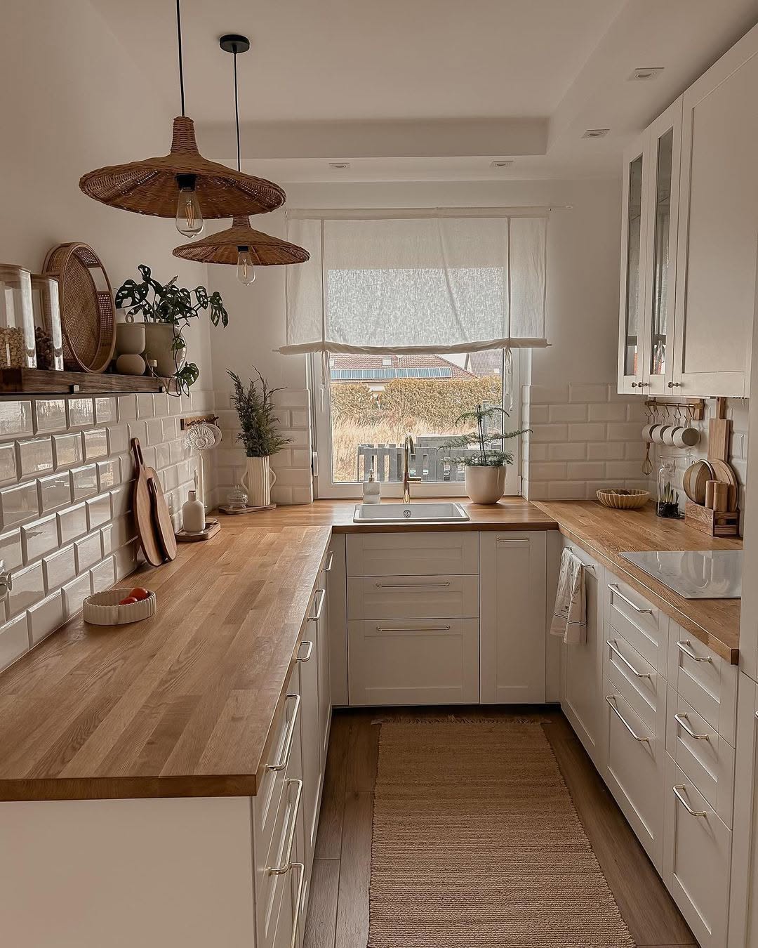 There’s a balance here that feels very IKEA, but elevated. Creamy white cabinets bounce light around the room, and fluted pendant lights add warmth without demanding attention. Rattan bar stools soften the space and make it feel human. Even the chevron flooring adds pattern gently, without disrupting the calm. Muted colors, hidden appliances, and lighting that adds character rather than noise make this one feel easy to live with.