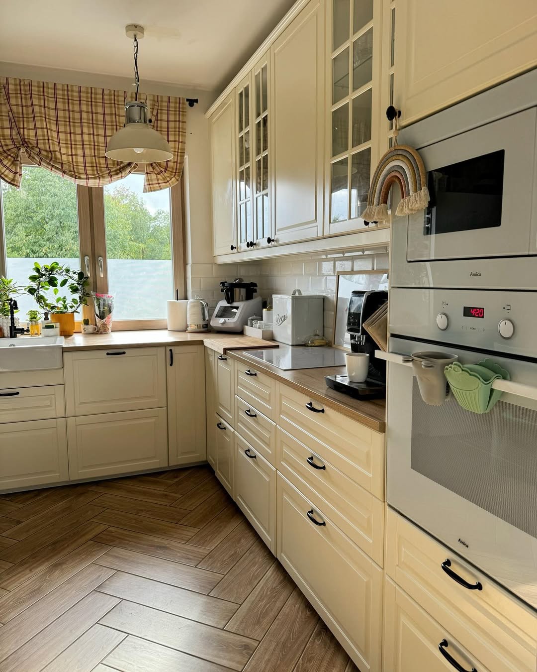 There’s a lived-in quality here that feels genuine. Plaid curtains frame the windows, vintage-style lighting warms the room, and cream cabinetry keeps everything soft. Black hardware adds definition, and herringbone floors bring subtle movement. Personal details give the space character that can’t be copied straight from a catalog.