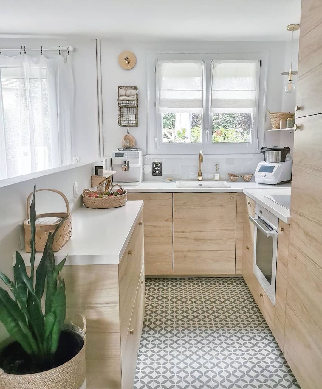 Natural light is the star of this kitchen. Pale wood cabinets glow throughout the day, white countertops keep things bright, and brass fixtures add just enough refinement. Woven baskets and Roman shades bring texture, while the geometric flooring adds pattern without overpowering the space. Light materials and sunlight work together to carry the design.