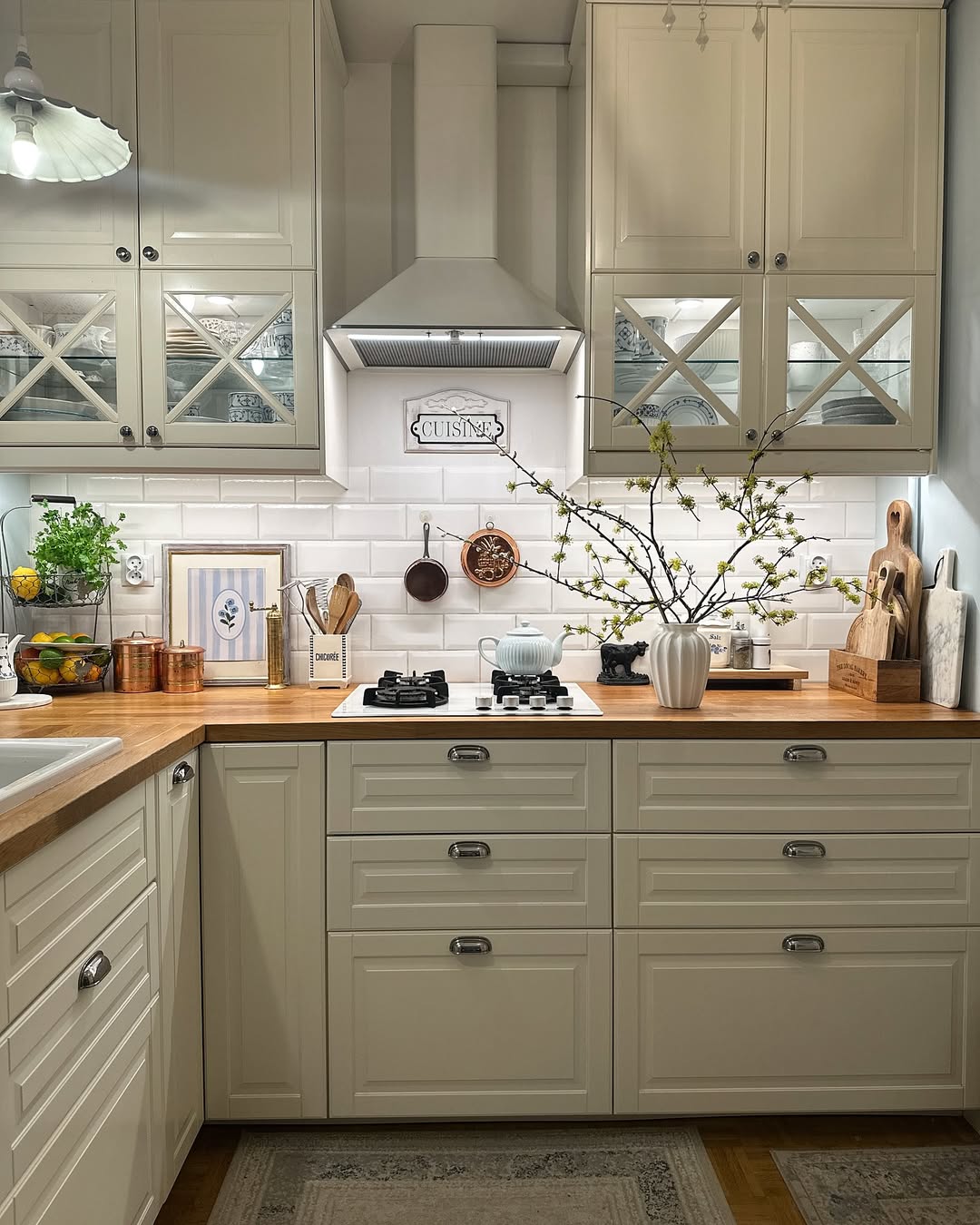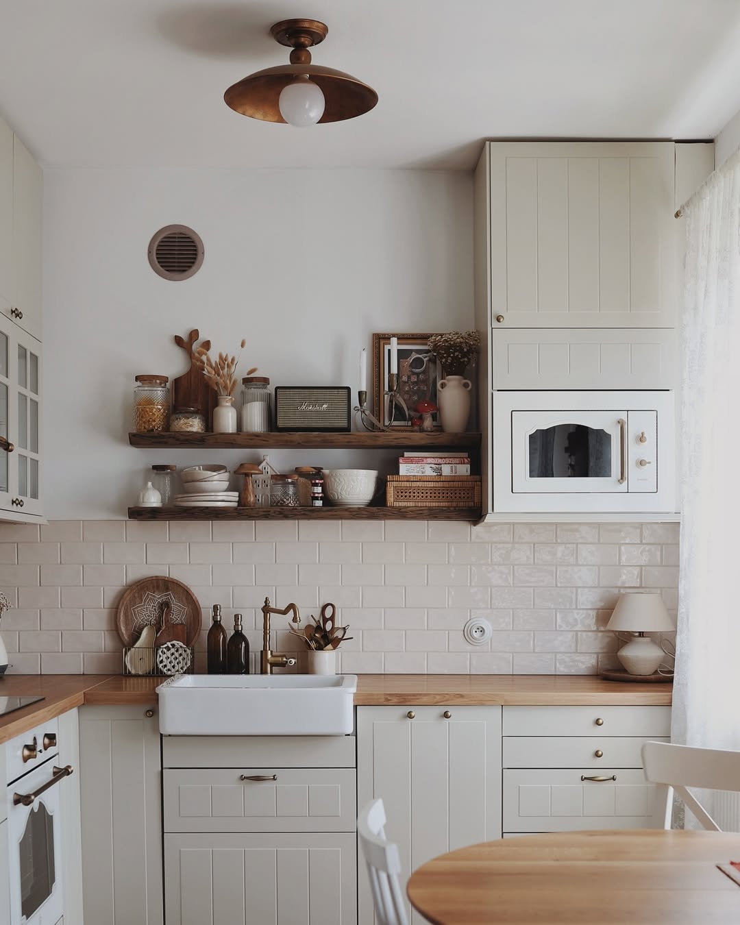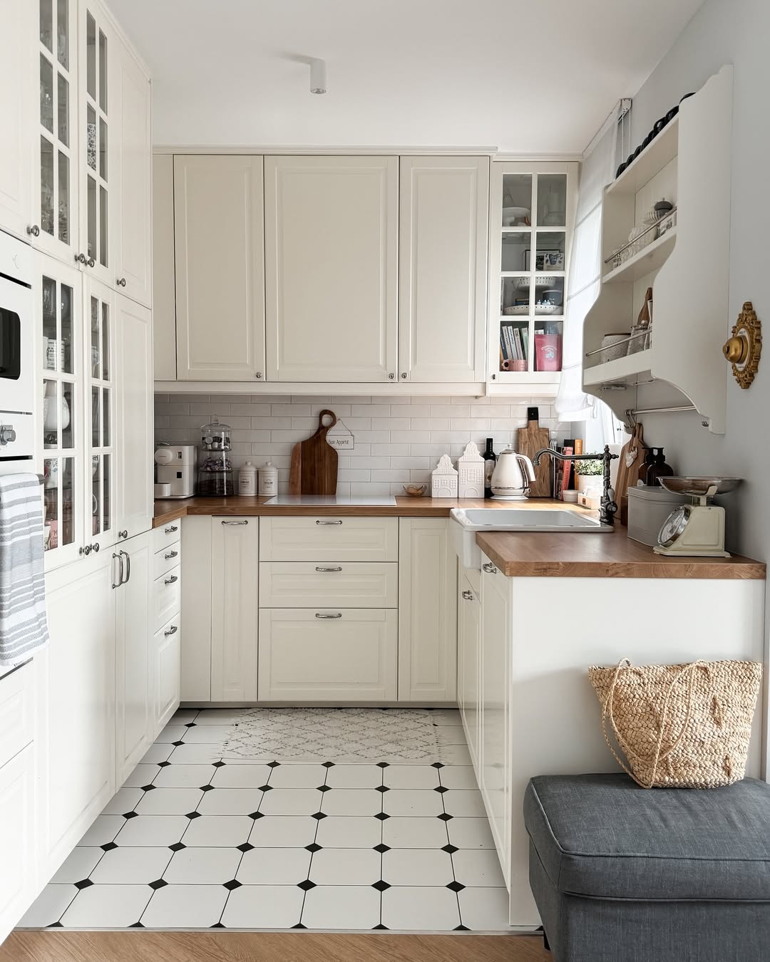 This kitchen proves that compact doesn’t mean compromised. Creamy shaker cabinets keep things classic, while butcher block countertops bring warmth and texture. The black-accented vintage tiles ground the lighter palette and add personality underfoot. Glass-front cabinets and open shelving keep the space visually open, which matters in smaller layouts. The balance between closed storage and display makes everything feel intentional rather than crowded.