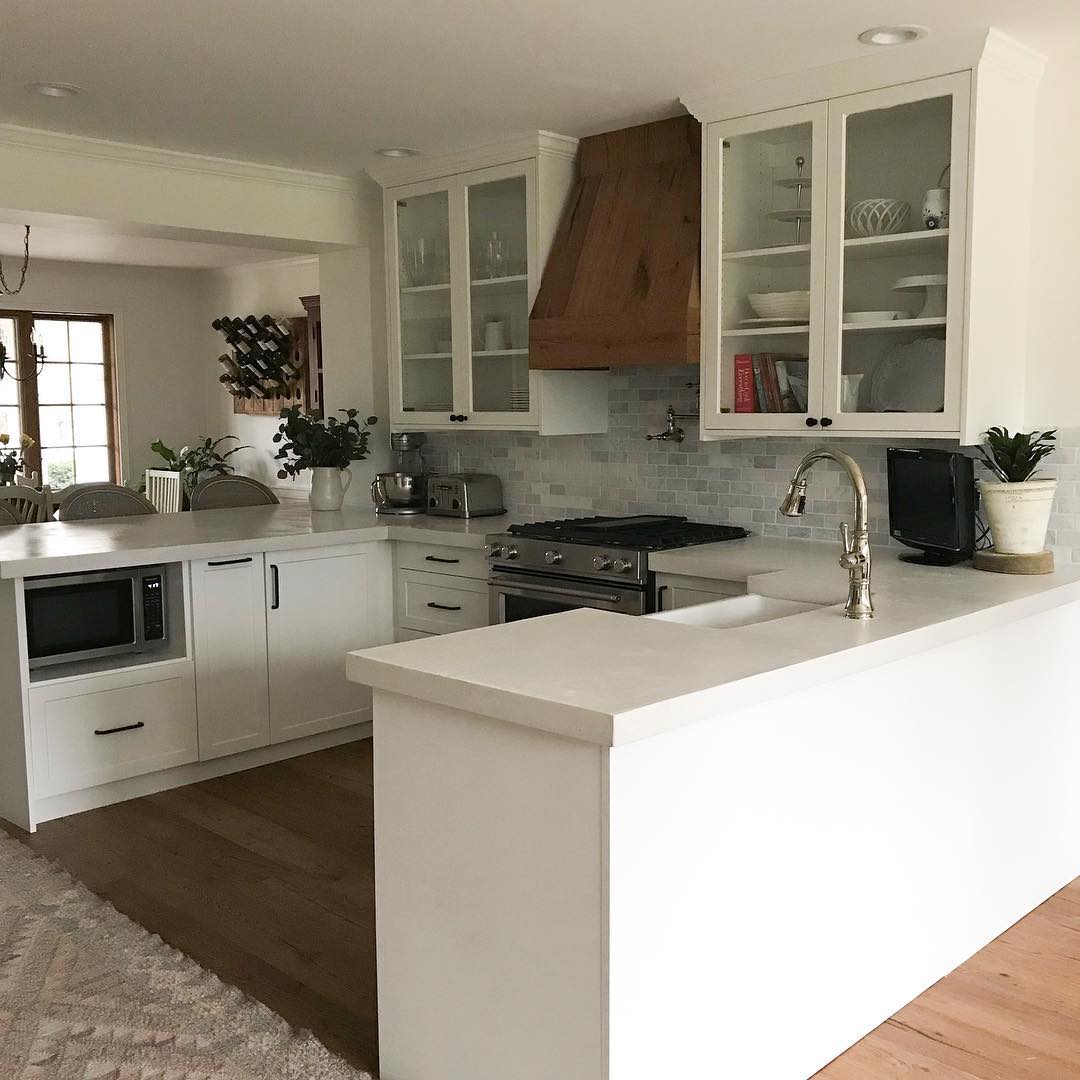 This kitchen sits comfortably between eras. Shaker-style cabinets bring familiarity, while the subtle veining in the backsplash nudges things modern. The wooden range hood softens the mostly white palette and pulls the eye upward, which makes the space feel taller somehow. It’s practical, warm, and flexible. The kind of kitchen that doesn’t feel trendy now and probably won’t feel dated later either.