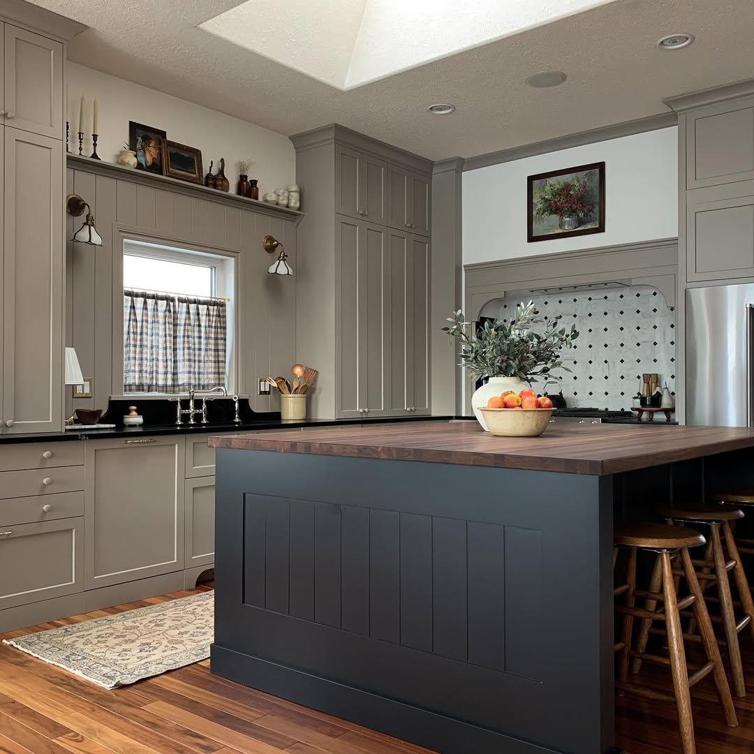 This kitchen has presence without being heavy. Muted taupe cabinetry sets a sophisticated tone, paneled walls add structure, and the navy island anchors the room with confidence. Vintage sconces cast warm, flattering light, while patterned tile in the backsplash niche adds a subtle layer of interest. Wood countertops soften the darker elements. Everything feels layered and thoughtful, like it was built over time.