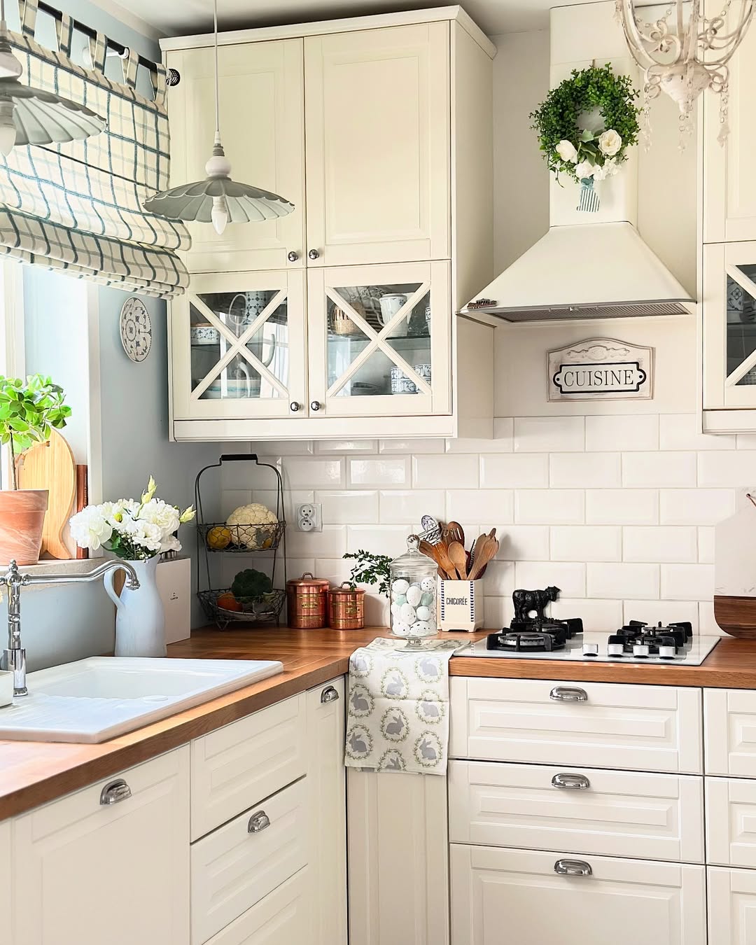 This one feels like it wandered in from Provence but decided to stay practical. Glossy subway tiles bounce light around, the X-mullioned glass cabinets add that classic French charm, and the warm wood counters keep everything grounded. Vintage-style hardware does a lot of quiet work here. Copper details and small decorative touches layer in personality without tipping into theme-y. It’s romantic, sure, but still very functional, which is what keeps it believable.