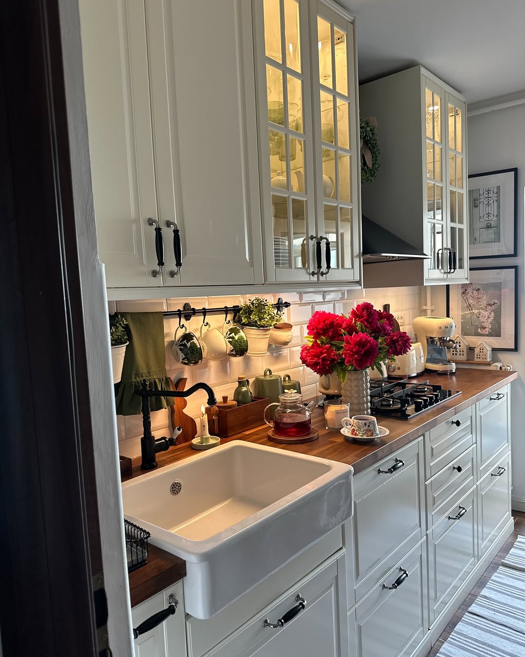 There’s an instant sense of welcome here. Cream glass-front cabinets keep the space open, the farmhouse sink anchors the layout, and wood countertops bring natural warmth. Black accents add contrast in just the right places. Fresh flowers, cup hooks, and small details make it feel lived-in rather than styled for a photo. It’s familiar, cozy, and easy to love.