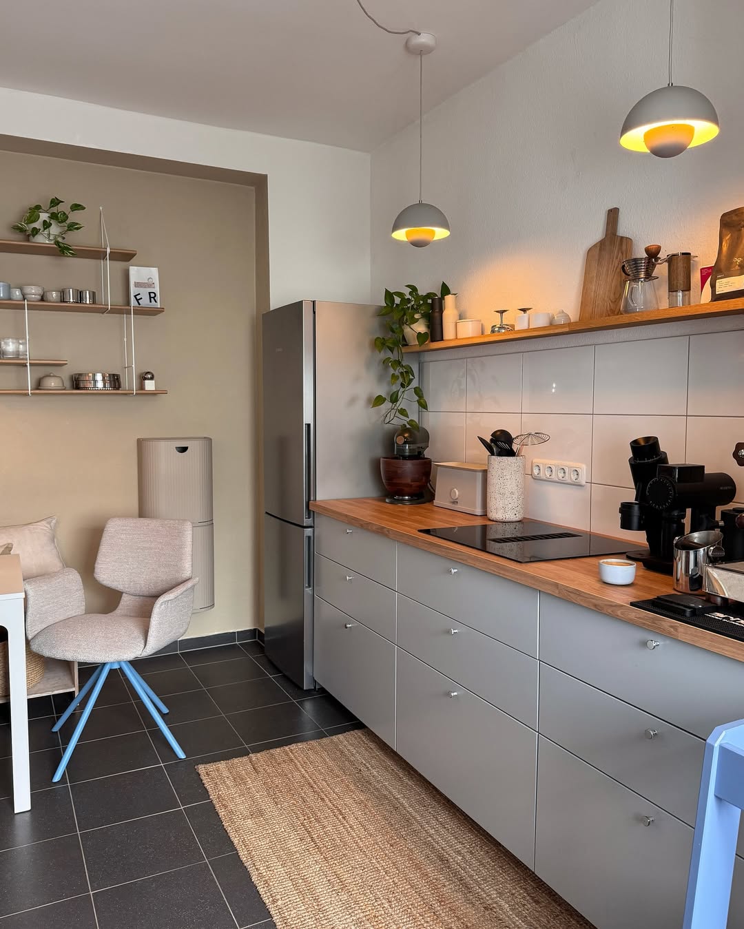 Muted tones and clever storage do most of the work here. Matte grey drawers hide a surprising amount, while wood countertops soften the modern edges. Gold pendant lights hang overhead like subtle punctuation marks. The geometric tile floor adds quiet movement, and the chair and jute rug bring in texture so the room doesn’t feel too spare. Soft color blocking, natural materials, and lighting that feels deliberate without being heavy.