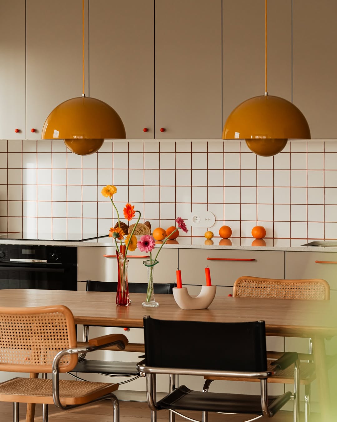 Bold choices, but handled carefully. Terracotta grid tiles warm up the walls, mustard dome lights add sculptural interest, and red drawer pulls bring in energy without chaos. Cane chairs keep things grounded and familiar. The colors repeat just enough to feel intentional, and the graphic tile layout creates rhythm. It’s playful, but controlled. Nothing feels accidental.