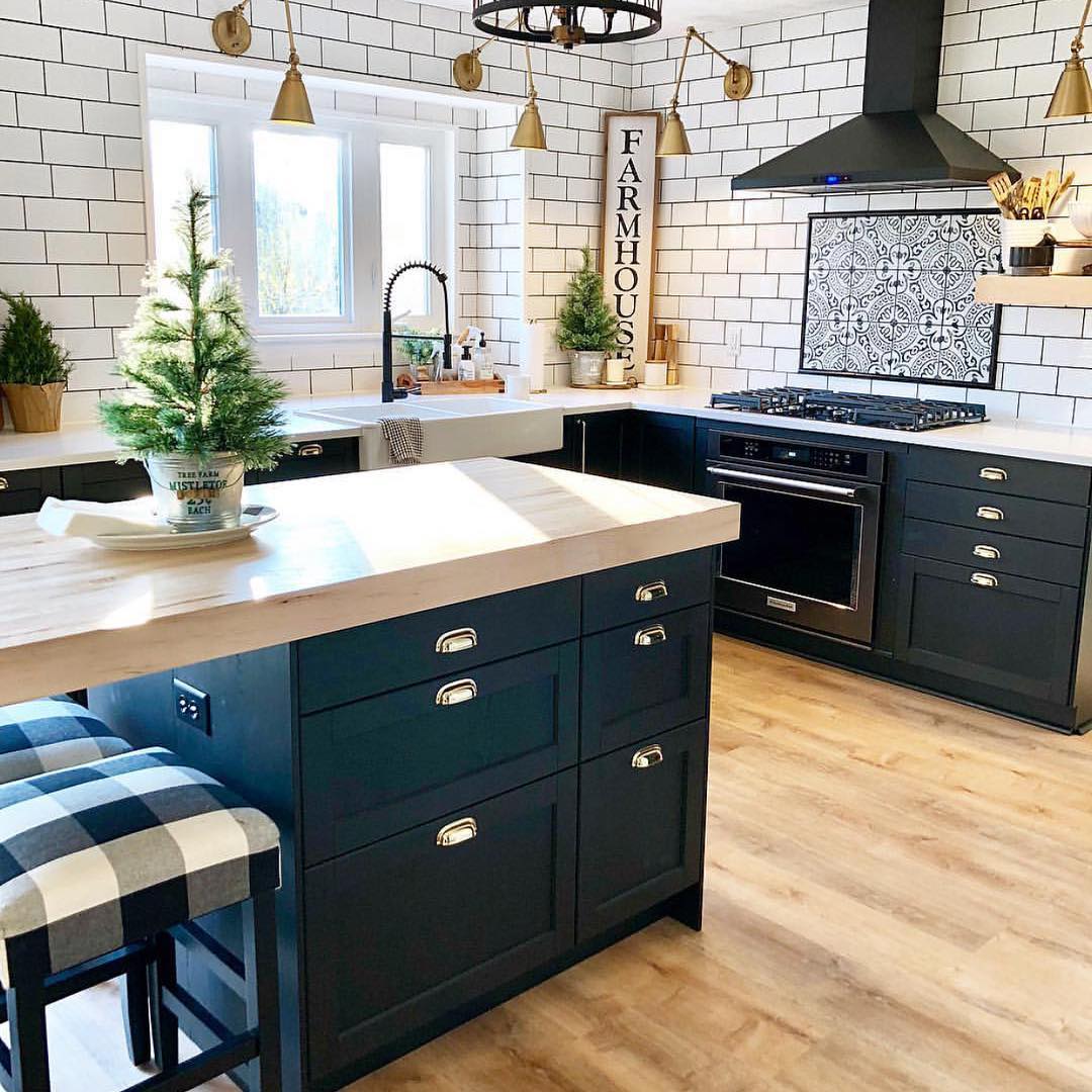 This kitchen isn’t afraid of depth. Navy cabinets anchor the space, brass fixtures catch the light, and checkered stools add a playful note. Oversized subway tiles give the eye a place to rest, while the ornate stove backsplash becomes a natural focal point. The butcher block island adds warmth, balancing out the polished finishes. Even the small decorative touches feel personal rather than decorative for the sake of it.