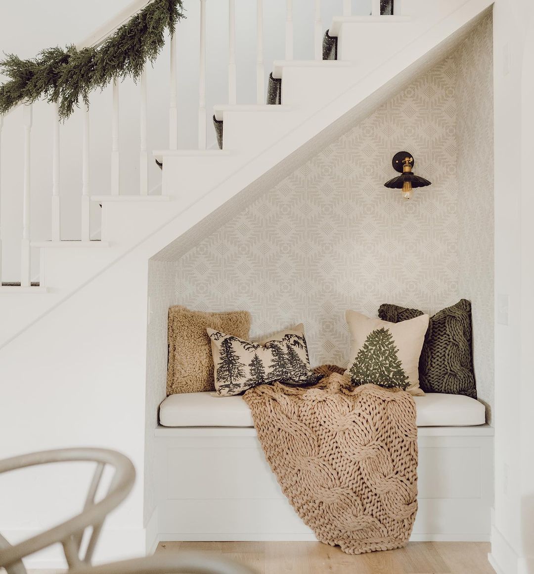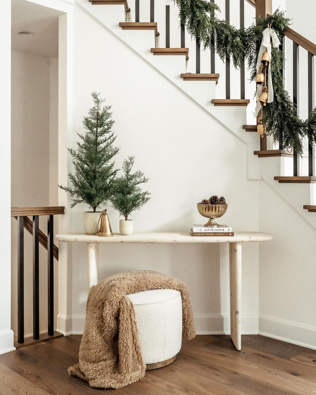 We adore the bright and refreshing aesthetic of this entryway table. The pine garland, ornaments and trees, and soft green throw blanket create a lovely welcoming atmosphere right as you walk into your home.