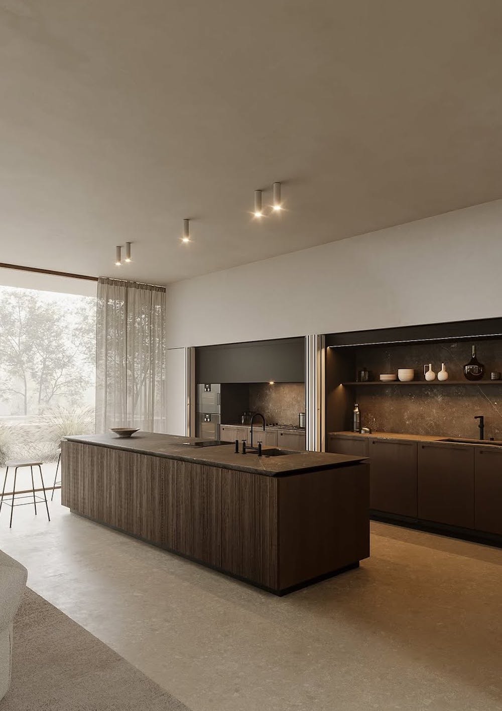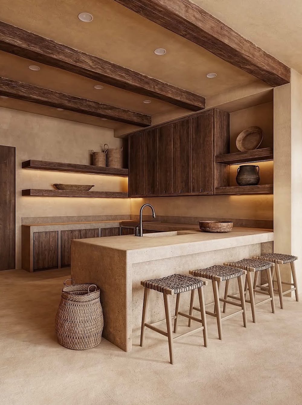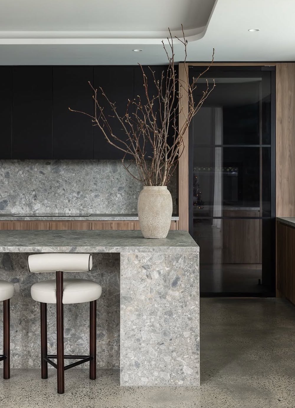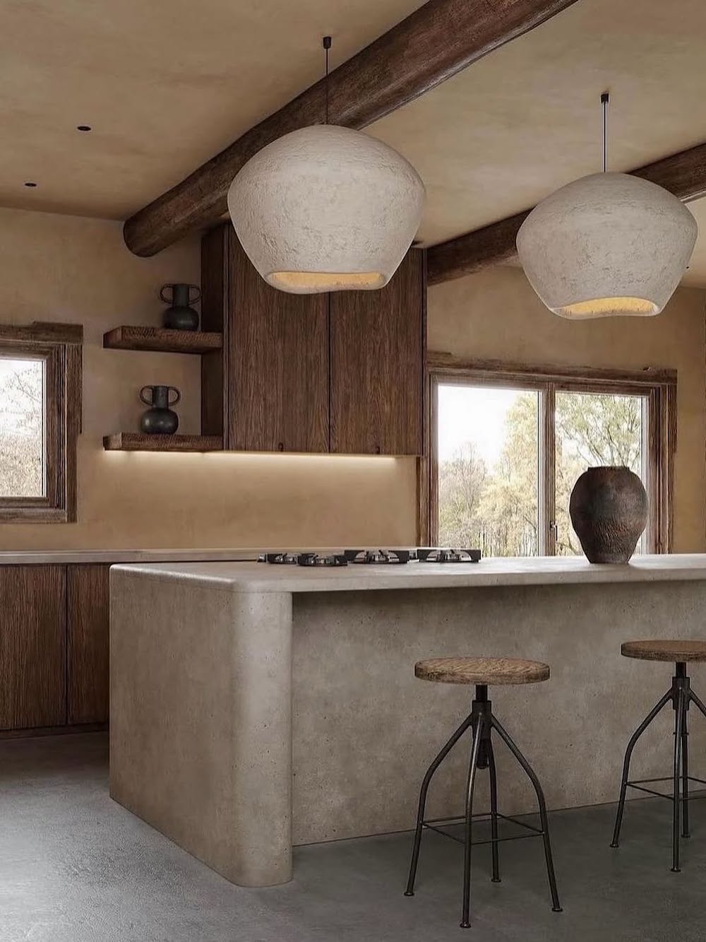 Use stony textures in your space (for the floors, walls, counters, islands, etc.) to add depth and an organic flair. We love this as an alternative to traditional wood and marble, as this adds a rugged yet elevated touch to the space.