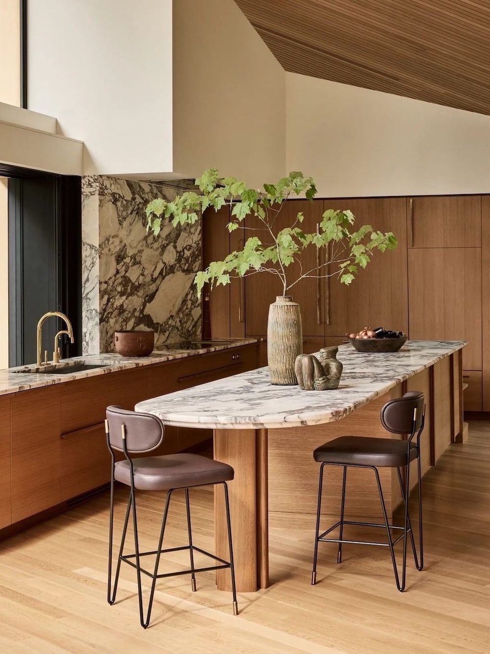 Opt for a natural wood island, cabinets, or seating to add natural beauty and a serene, grounded aesthetic.
