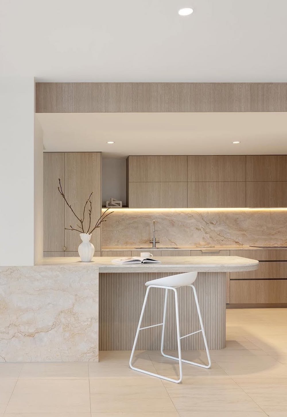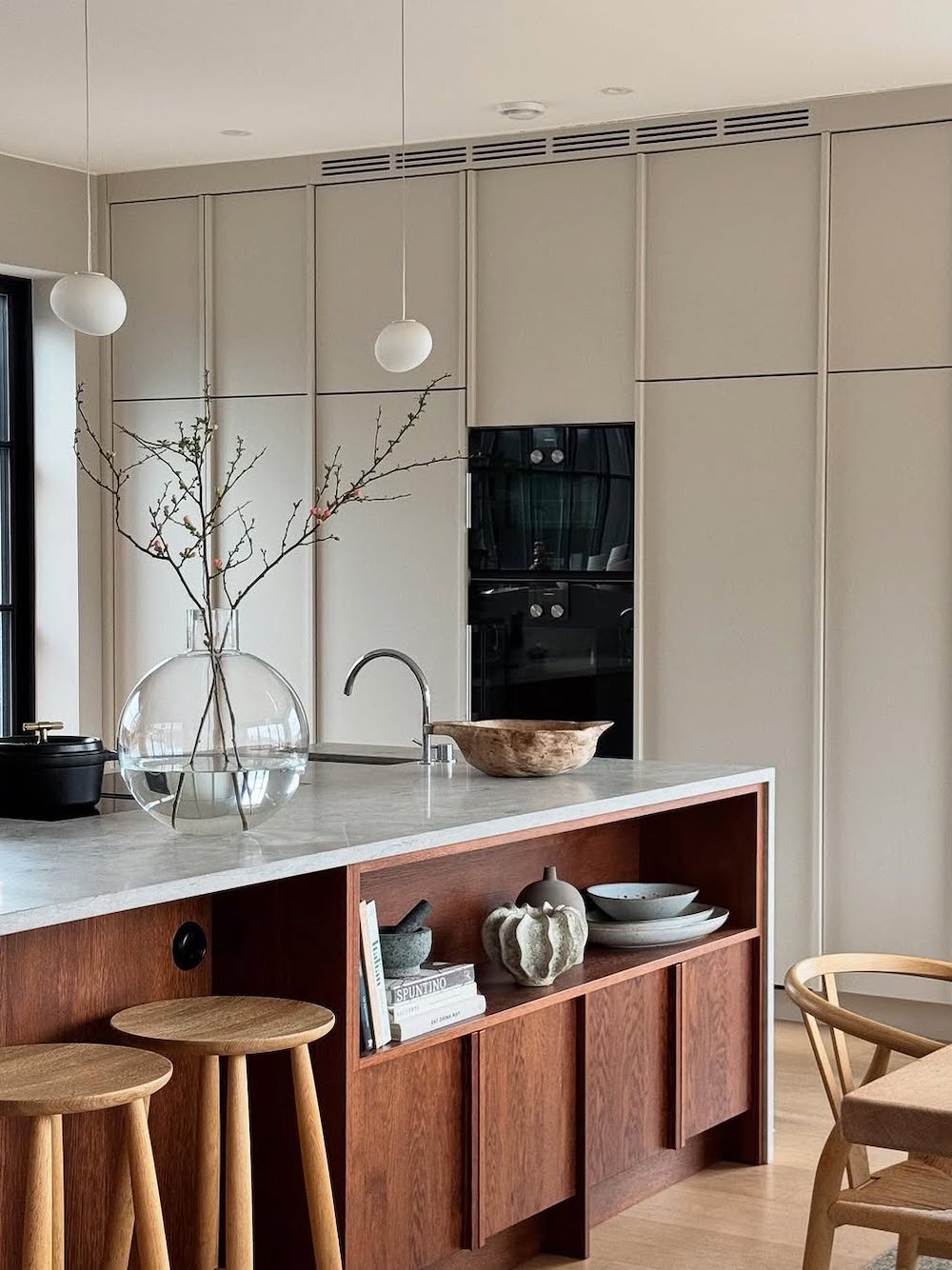 Organic materials, like wood and marble, are staples in a Japandi kitchen. We especially love the combination of these two, blending sleek, elevated marble with the rugged look of natural wood.