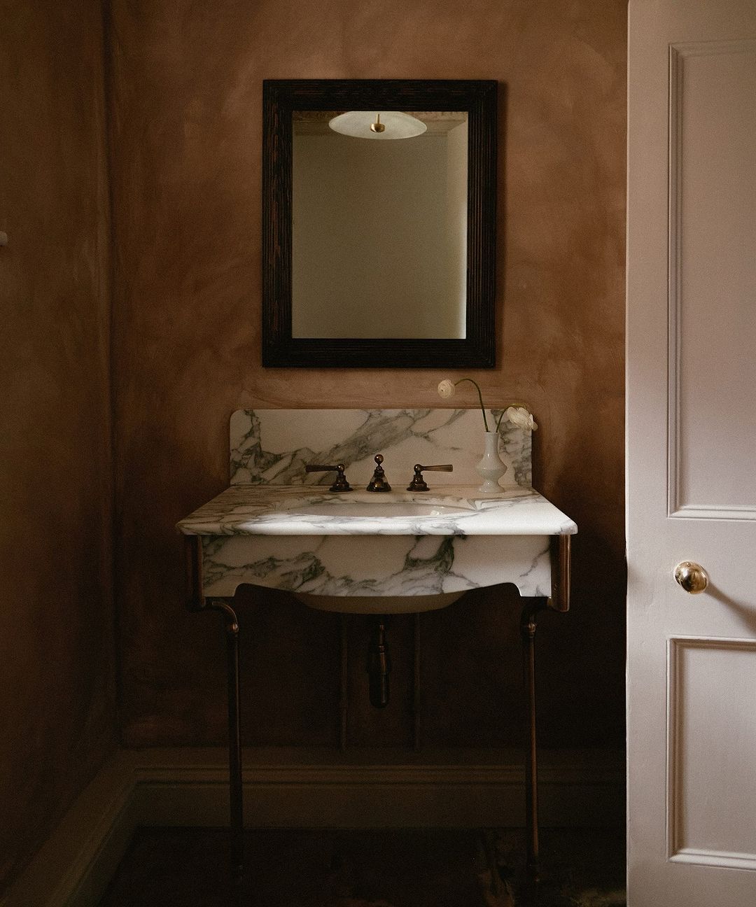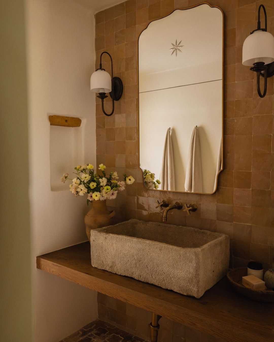An warm, earthy limewash wall treatment, thrifted mirror in a deep wood tone and a bold stone vanity is all it takes to drop jaws in this space.