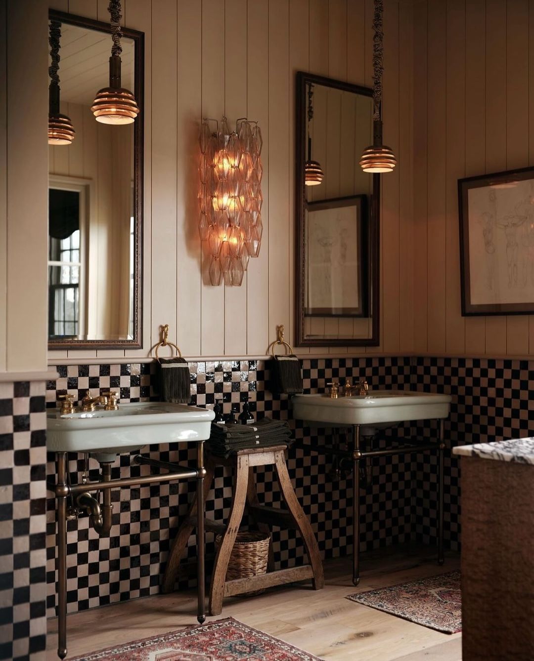 We love the addition of bright but earthy tones in a moody bathroom. This room has a stunning colorful vibe, yet there’s a richness in both the light and dark hues that works for the moody aesthetic.