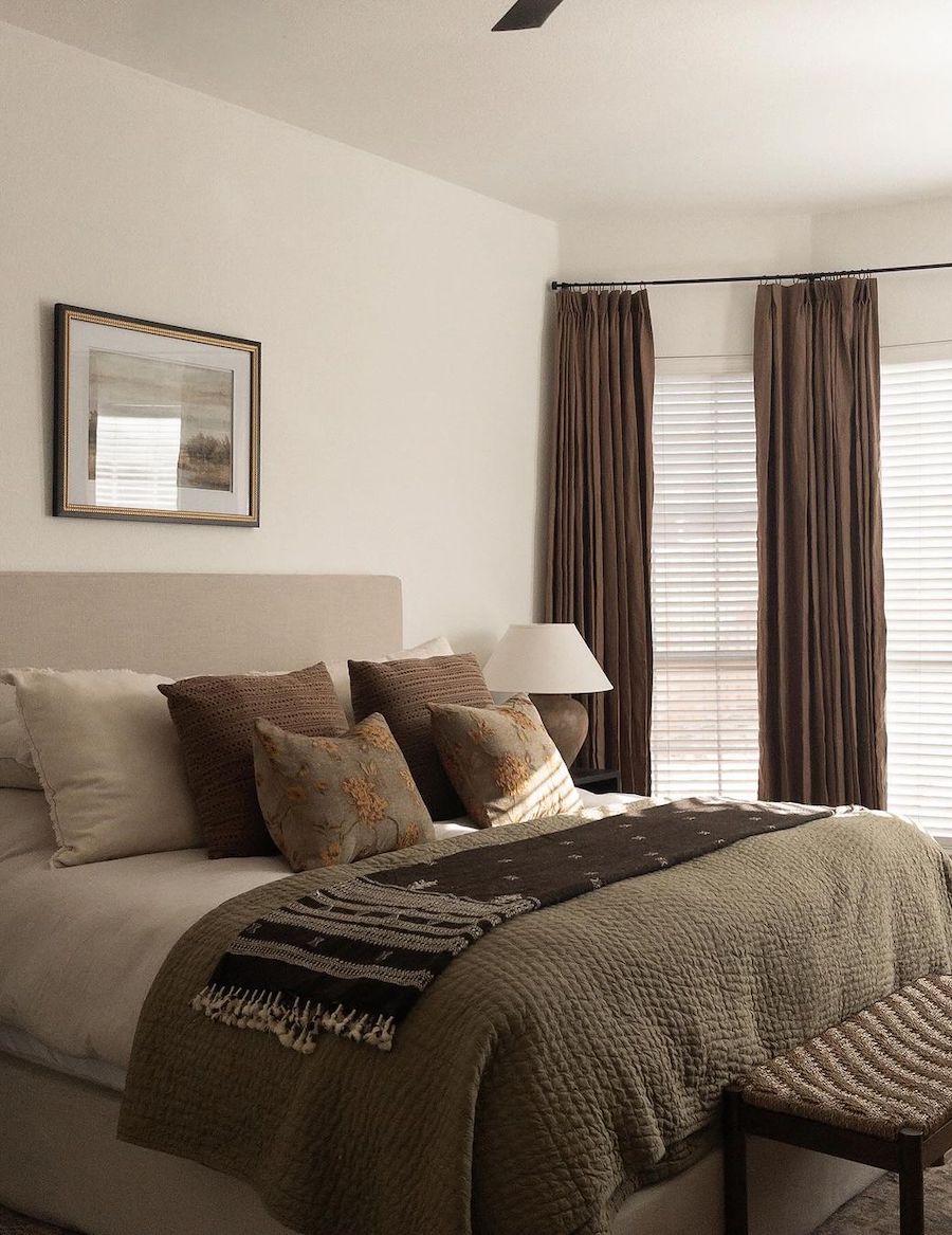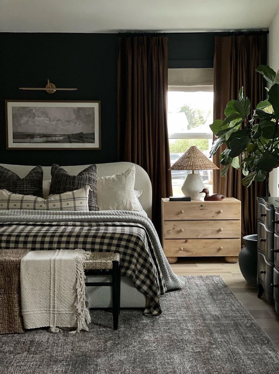 This room shows just how powerful intentional layering can be. The heavy drapes layered over a dark-painted wall and the mix of blankets and linens layering the bed creates a moody vibe that feels oh-so-cozy.