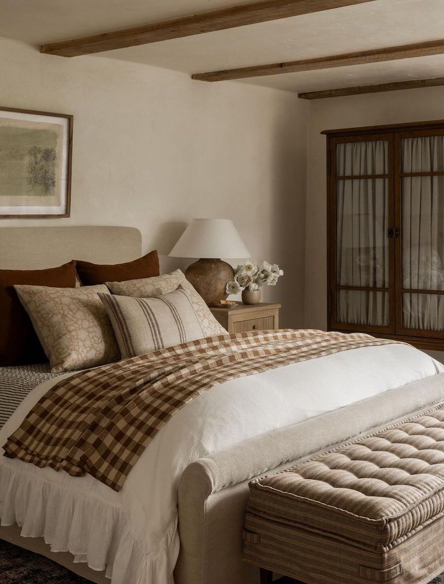 Rustic charm meets elegant design in this moody bedroom, featuring gorgeous wood beams (our fave!!) and soft, neutral linens with pops of rich color. The balance of earthy hues and classic patterns makes for a very relaxing and stylish retreat – breakfast in bed anyone?!