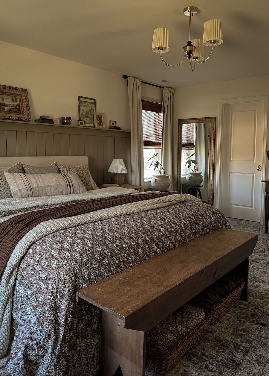 This lovely bedroom has a country charm with a vintage wooden bench, layered linens with vintage-inspired patterns, and a pretty green wainscotting detail. These features give a moody aesthetic that is not necessarily “dark” but very cozy.