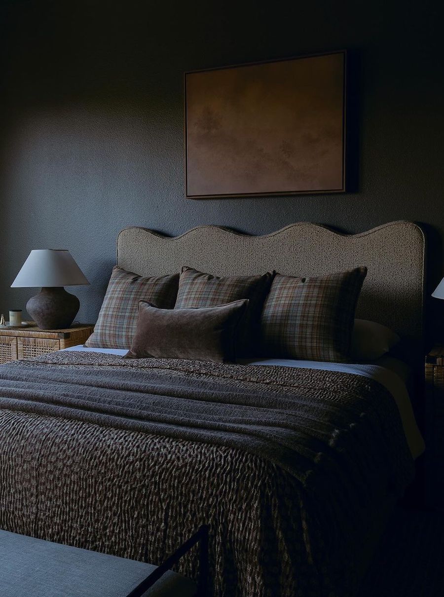 When a moody bedroom comes to mind, we picture deep, rich colors (paint, prints, or textiles), soft textures, and a warm and inviting atmosphere.