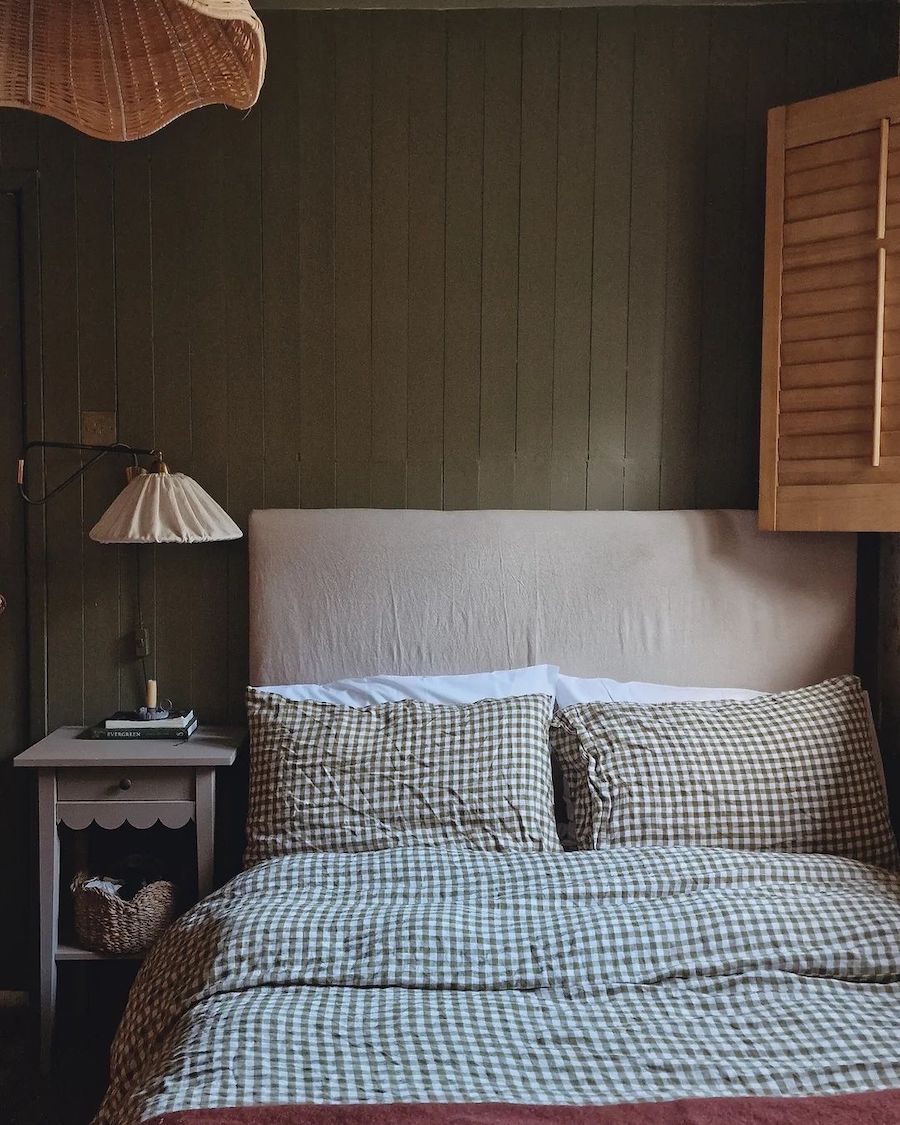 This bedroom transports us to a dark and cozy English cottage with checkered sheets, an earthy green shiplap wall, wood shutters, and a woven light fixture. This gingham sheet set is perfect for a guest room or kids’ space.