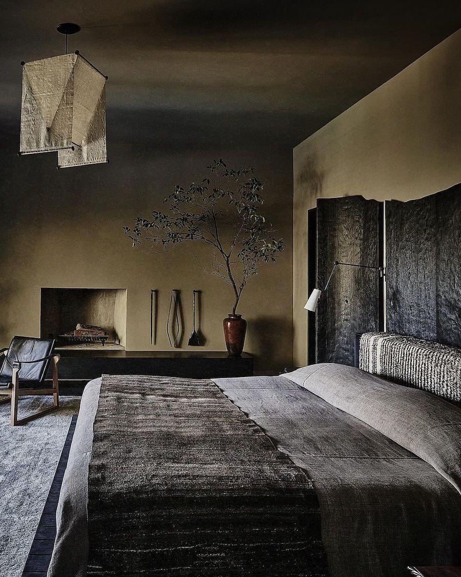 This next dark and moody bedroom has a wabi-sabi aesthetic that is very on trend in 2024. From the Shou Sugi Ban wood wall feature to the paper light fixture and black leather chair, this space is both masculine and cozy.