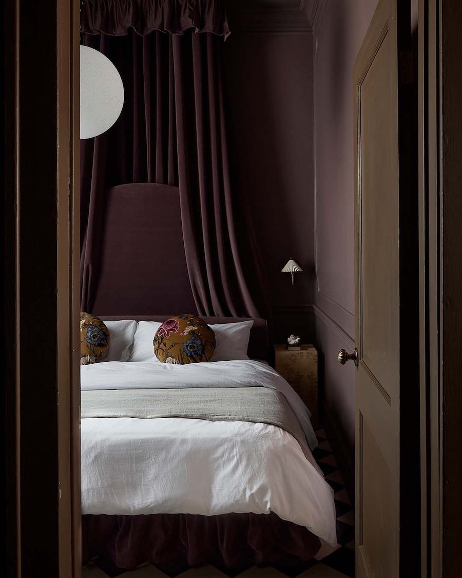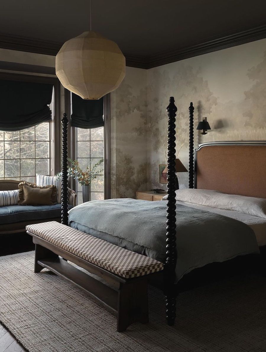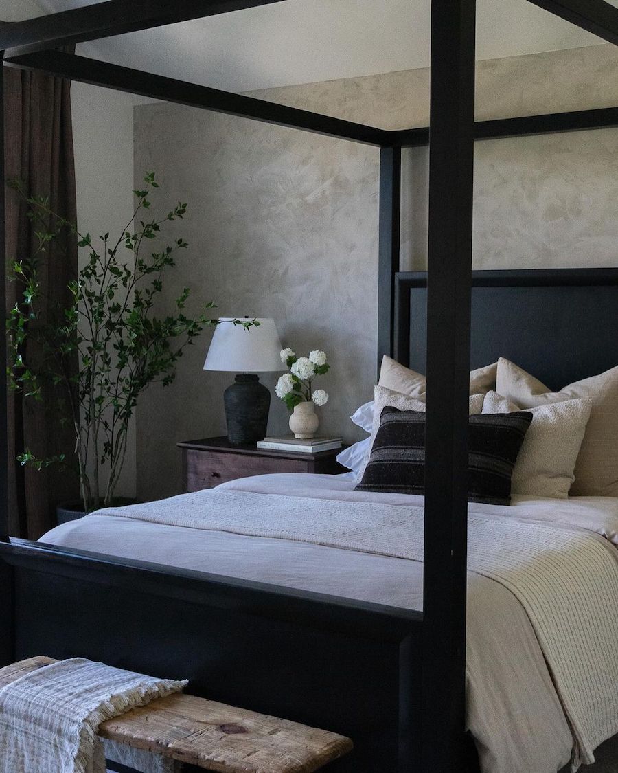 A four-poster bed is often the anchor in luxurious-looking moody bedrooms. In this space, we also love the addition of the vintage wood bench, Roman clay walls, and greenery. Très chic.