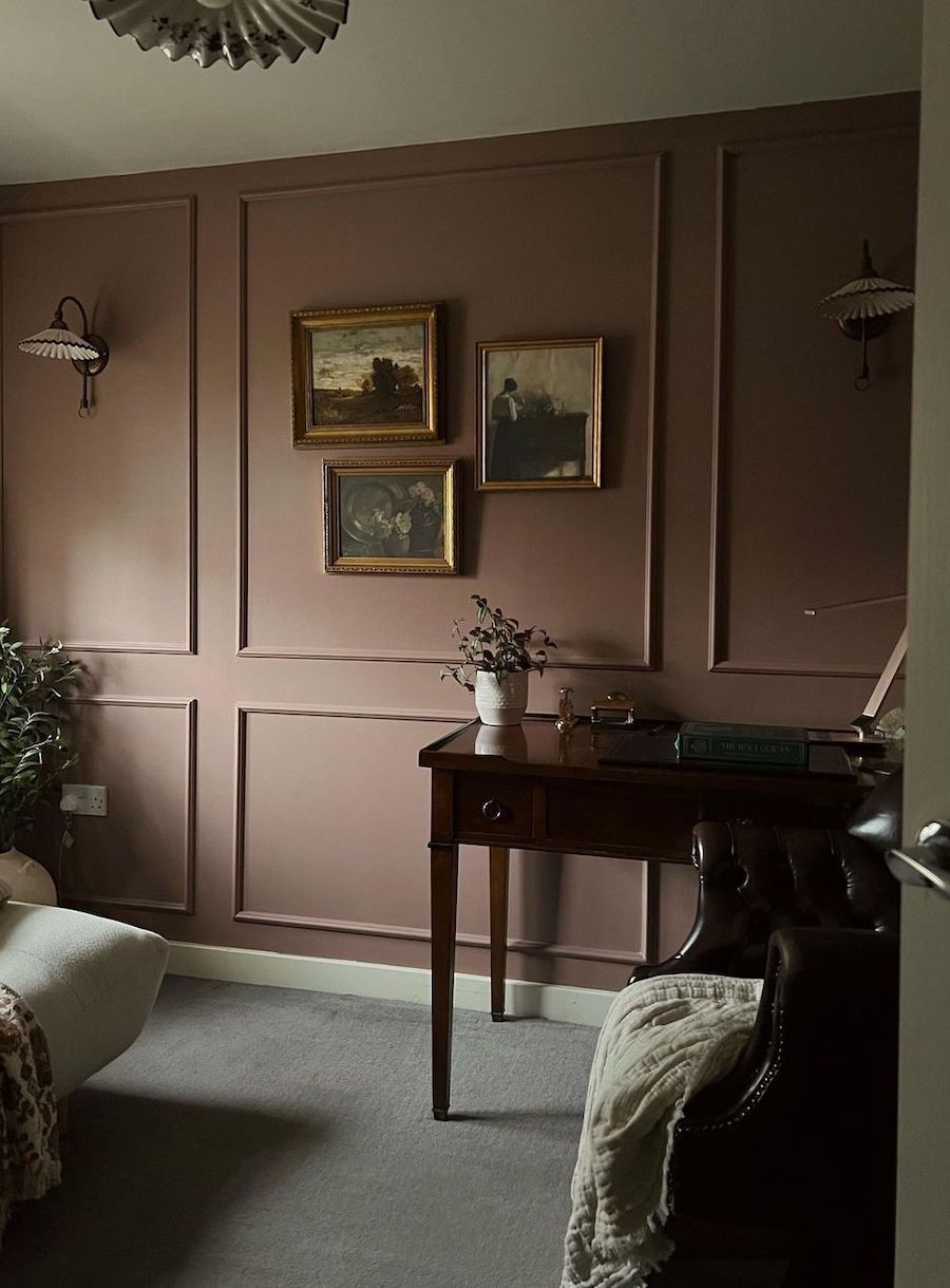 Mahogany leather, dark wood, chocolate paint, and vintage art give this bedroom its moody aesthetic. Wainscoting is a great way to add depth and texture to walls painted with deep and rich colors.