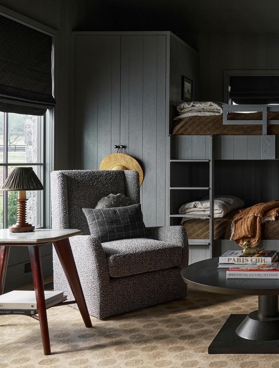 What a cute and cozy bunk room! We love the charcoal wood built-ins and boucle armchair. This moody space would be great for kids in a cabin or lakehouse.
