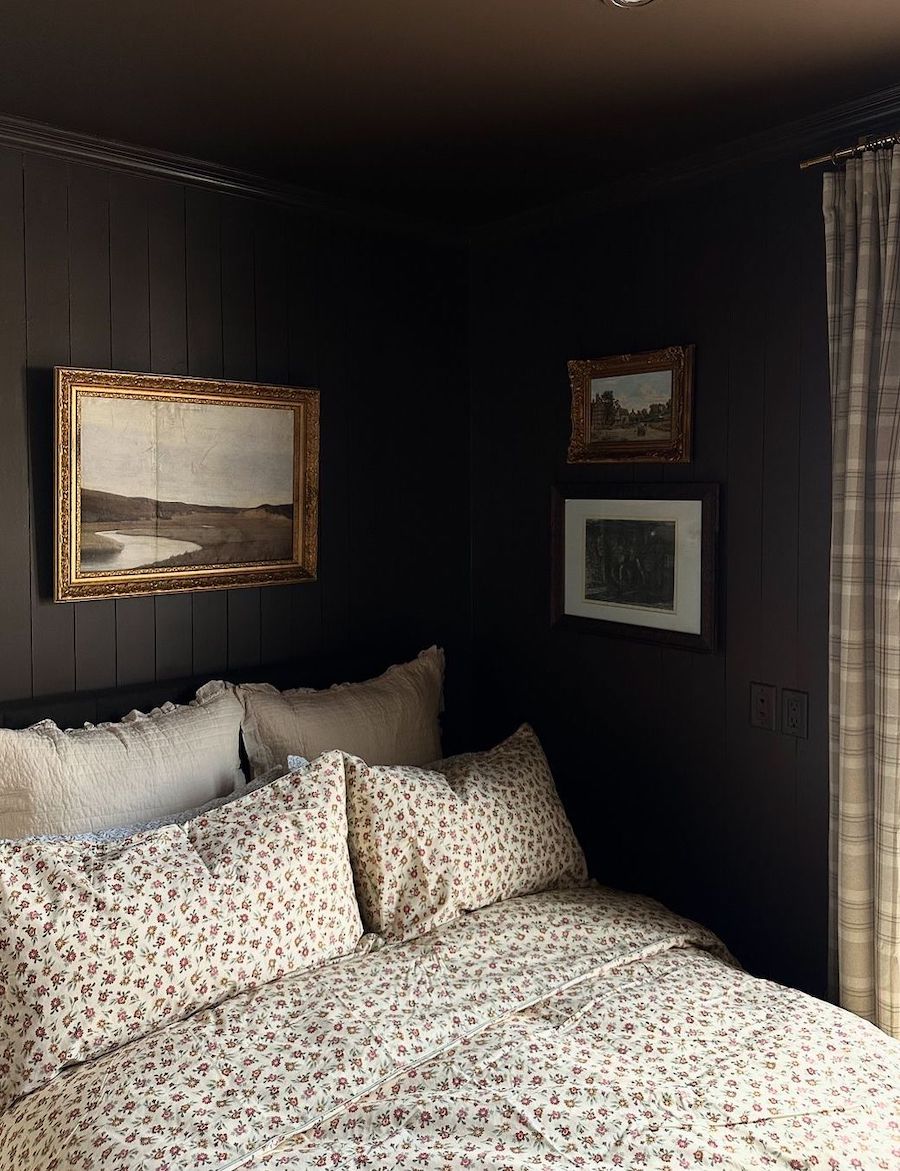 Create contrast like this moody bedroom with all dark walls and a dark painted ceiling, then brighter floral and plaid textiles. It gives the perfect moody vibe without feeling too dark in the space.
