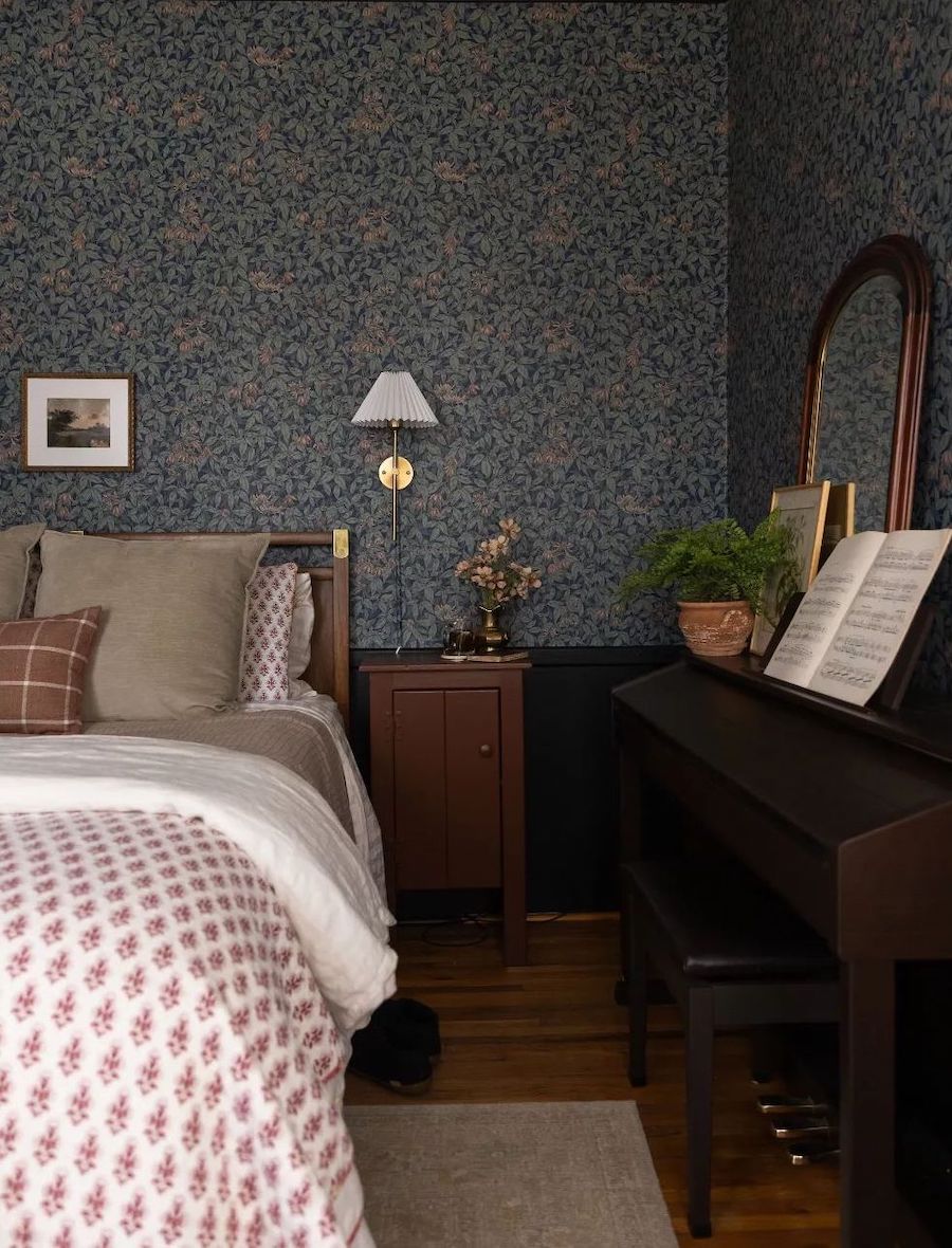 The dark floral wallpaper enveloping this entire bedroom is the main focal point and it makes such a statement. Coupled with dark chocolate wood tones and pretty printed linens, the result is moody yet feminine. We’re here for it!