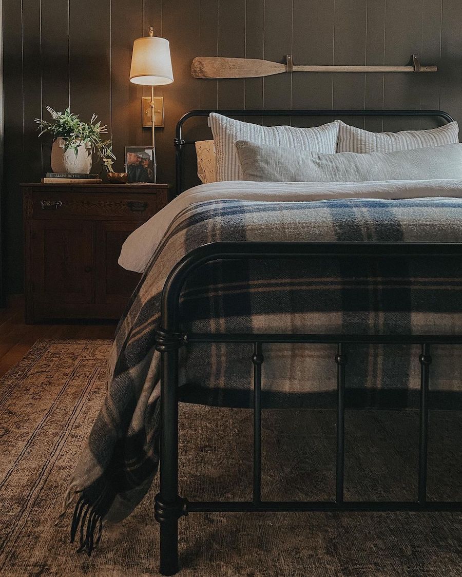 If you are going for a cozy lakehouse vibe, take inspiration from this bedroom with a major cabin-core aesthetic. From the plaid bedspread to the rustic oar, and the dark green shiplap wall, every element in this room is rustic and moody.