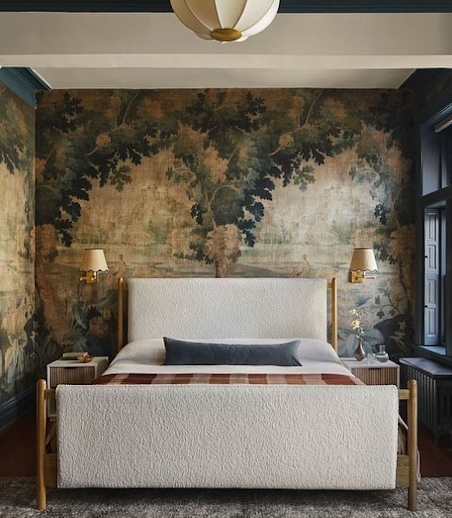 Wow, what a statement the wallpaper makes in this moody bedroom! We love how the floral walls and off-white boucle bedframe add a feminine touch to this stunning space.