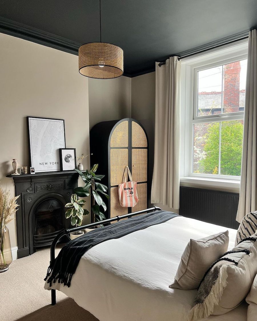 While this next bedroom has a lot of light tones, it still gives a moody vibe with the dark-painted ceiling and black accents. The aesthetic is eclectic but undoubtedly chic.