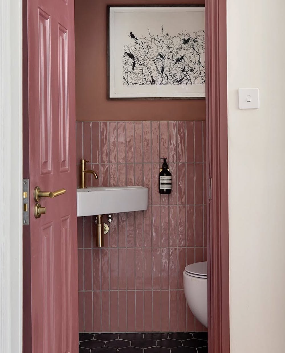 Looking for a feminine or vintage touch? You can choose to add a chic aesthetic to your small bathroom with beautiful floral wallpaper. Not only does it add a more “nature-based” feel, but it also immediately elevates the small space, especially when paired with a with a country-style waste bin, a floral piece, and a portrait-style mirror.