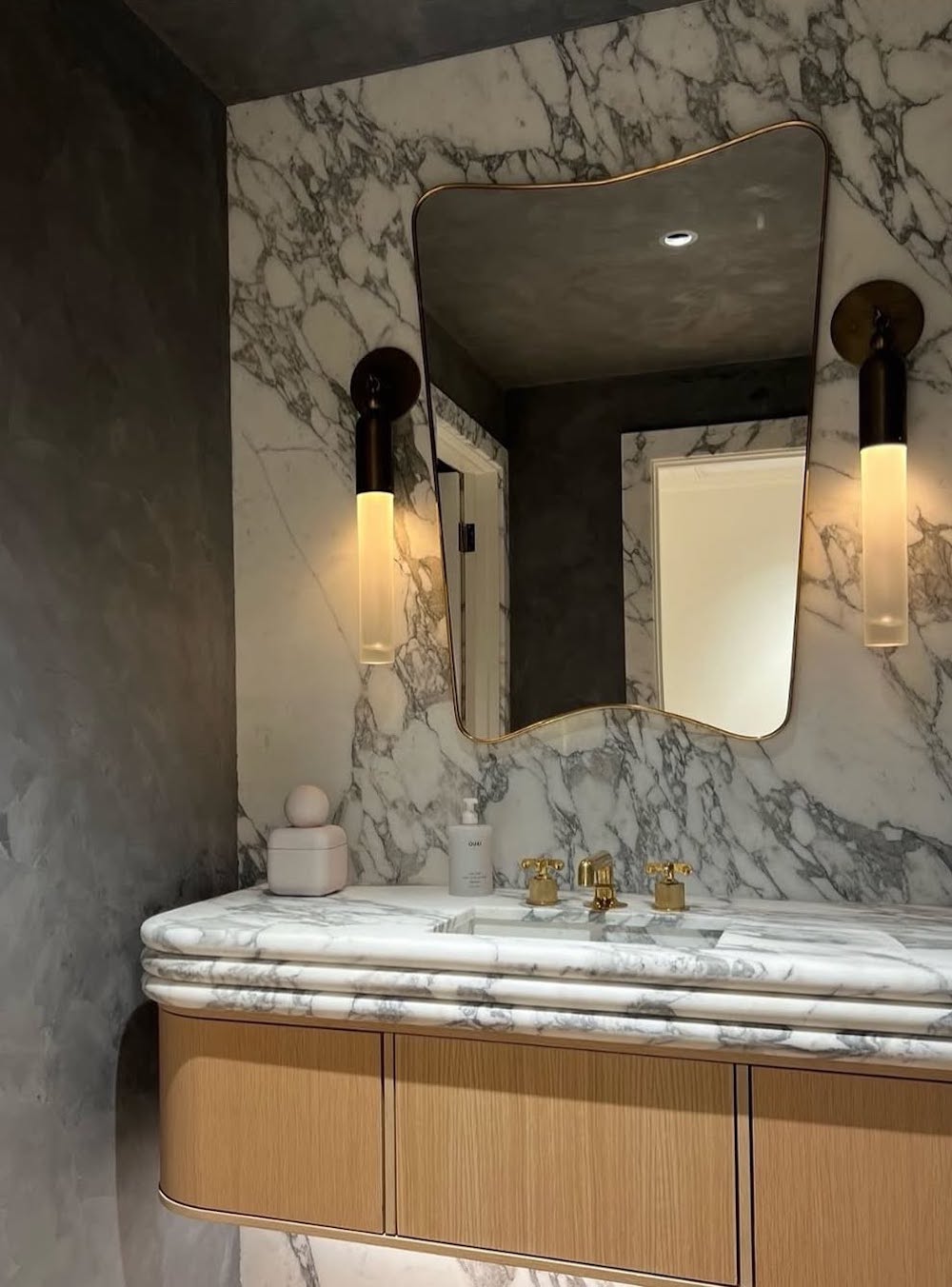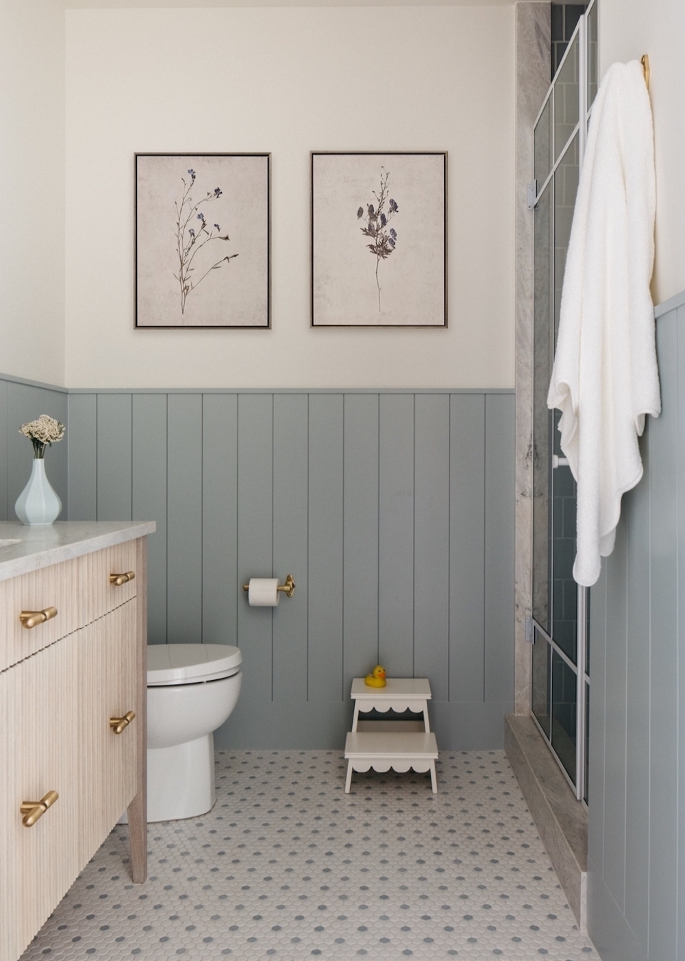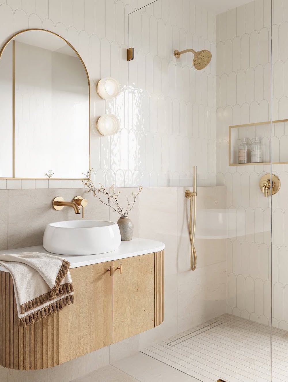 Combine different textures – like dainty floor tiles, board and batten, a fluted wood vanity, and a marble shower – to add warmth and visual interest without adding clutter.