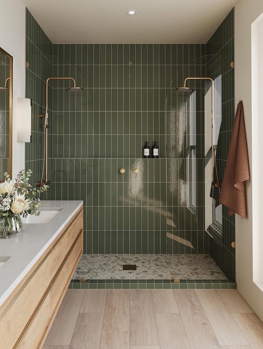 Make your shower the star of the show with tiles in rich colors or standout patterns. This rich, green tiling helps to visually separate the shower from the rest of the bathroom while creating a spacious aesthetic.