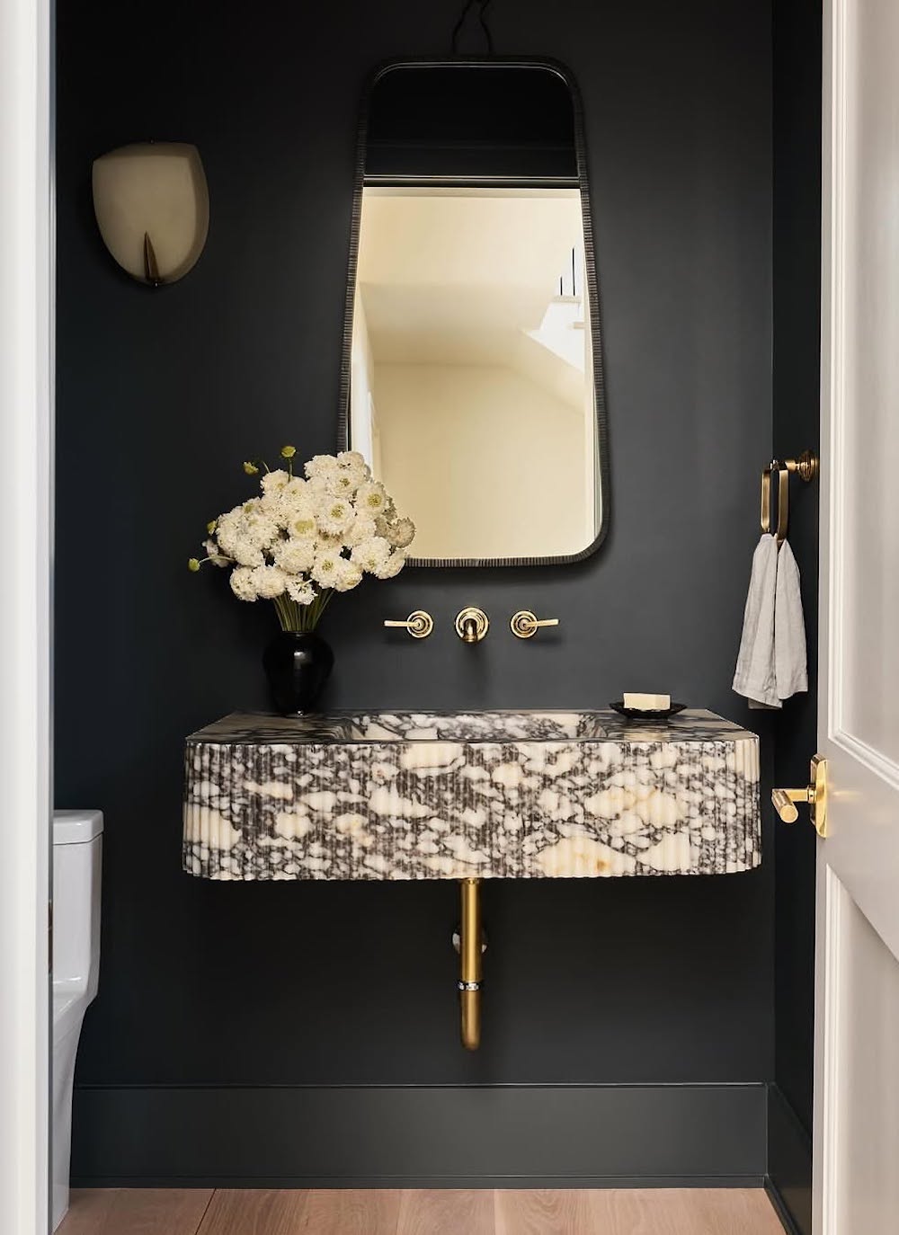 Use dark, moody colors on the wall, add patterned wallpaper, hang a bold mirror, or choose a daring sink to draw the eye in and transform your small bathroom into a pretty and practical powder room.