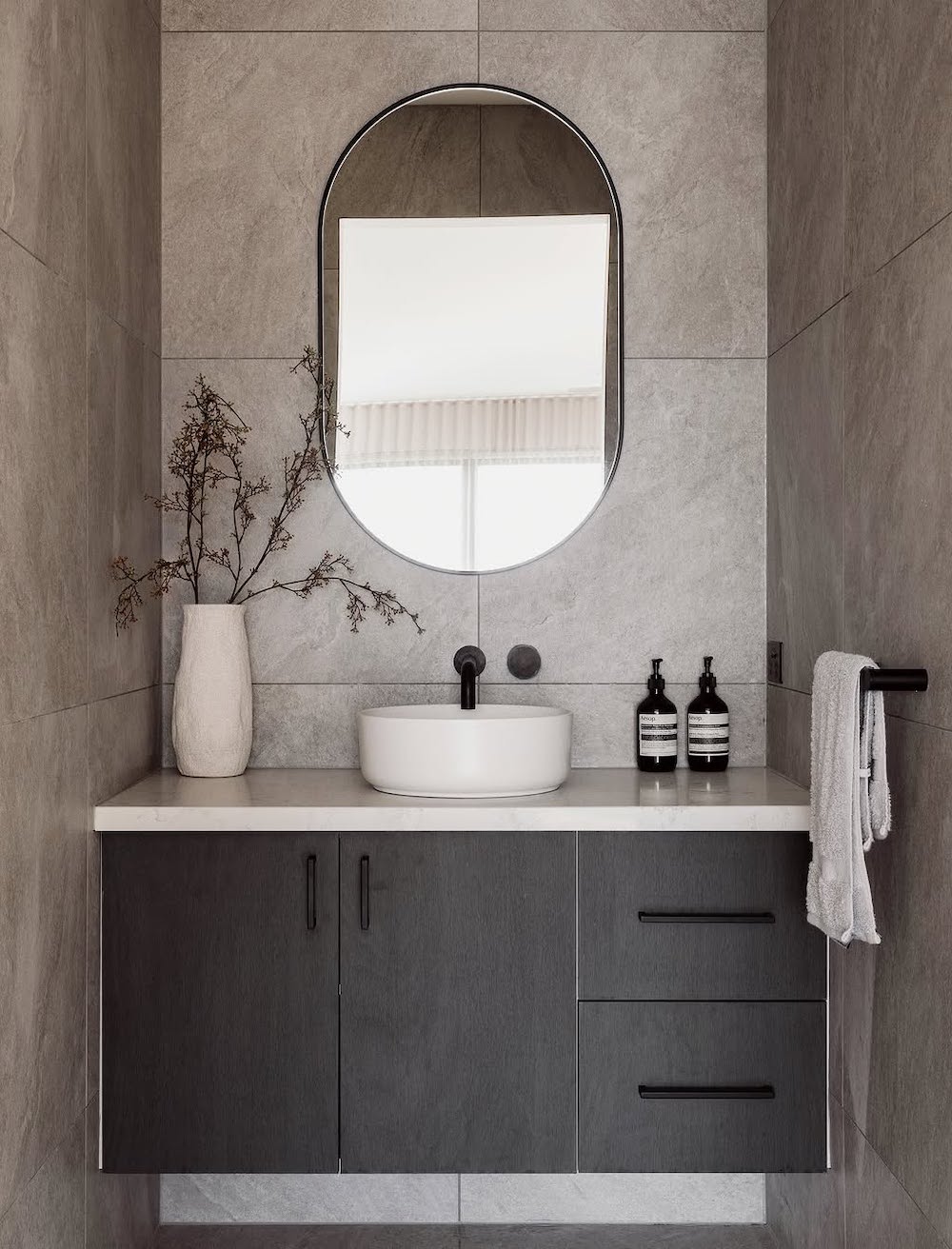 Use the same tiling for the floor and walls to create a seamless aesthetic, making your bathroom appear open and cohesive. For this, we recommend using a minimalistic tile in a soothing hue. This creates a simple base for the bathroom that you can later enhance with decor and furnishings.
