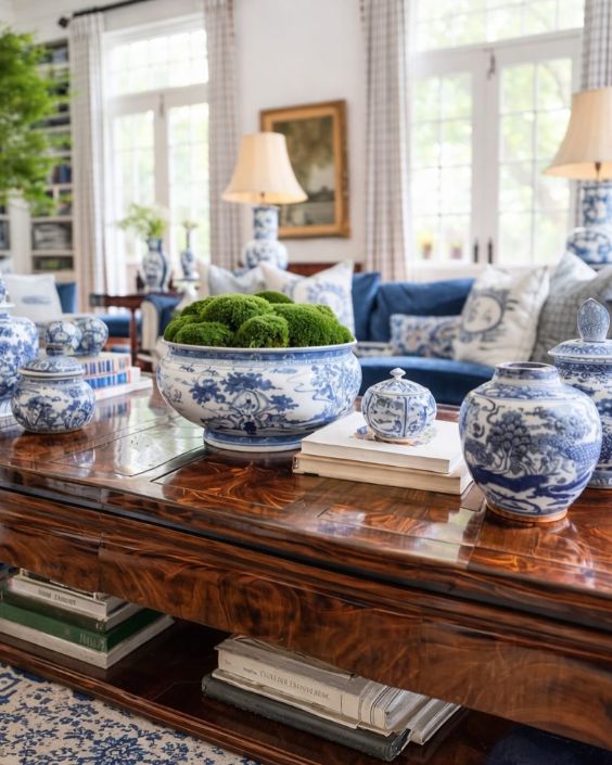 Moss, branches, stones, and woven baskets add depth and an organic quality that makes a space feel considered. A wide bowl filled with sheet moss makes a striking centerpiece on a dining or coffee table. Tall pussy willow branches in a floor vase bring vertical interest to a corner.